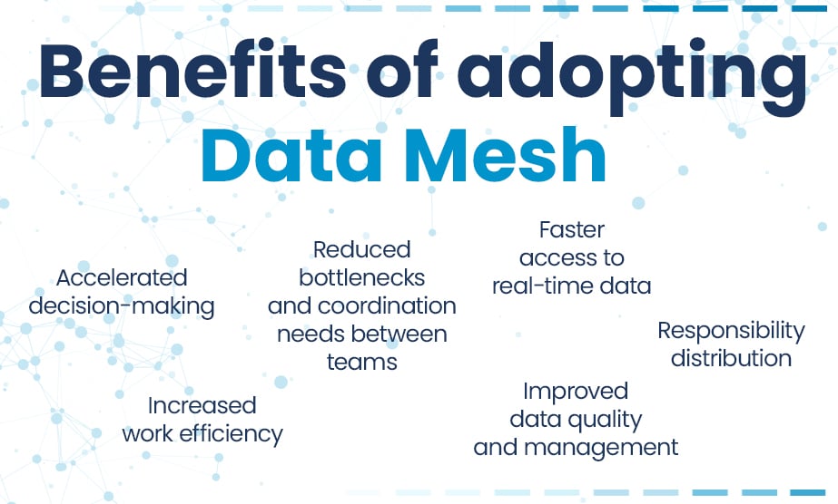 Organizations don’t have to choose between these two data visions. InTechHouse knows perfectly how to combine them to extract maximum benefits. Besides, several Data Fabric concepts align with the principles of Data Mesh. For instance, Data Mesh necessitates a comprehensive data catalog for efficient data exploration, a feature that can be facilitated by adopting some of the metadata management techniques inherent in Data Fabric. Moreover, a centralized Data Fabric can coexist alongside a Data Mesh by functioning as a substantial data entity within the broader Data Mesh framework.Benefits of Integrating Data Mesh and Data Fabric: