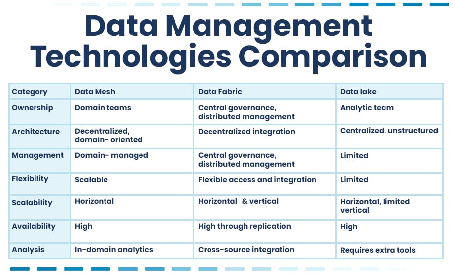 In the modern digital environment, businesses encounter a plethora of hurdles in managing data, primarily stemming from the exponential growth, diversity, and intricate nature of data, alongside the multitude of applications and users seeking access. Foremost among these obstacles is the imperative to adopt an optimal data framework and compatible technologies to align with evolving business demands and data specifications. In this brief article, we will guide you through the essential intricacies of data science: Data Mesh, Data Fabric and Data Lake, presenting their key aspects and benefits.