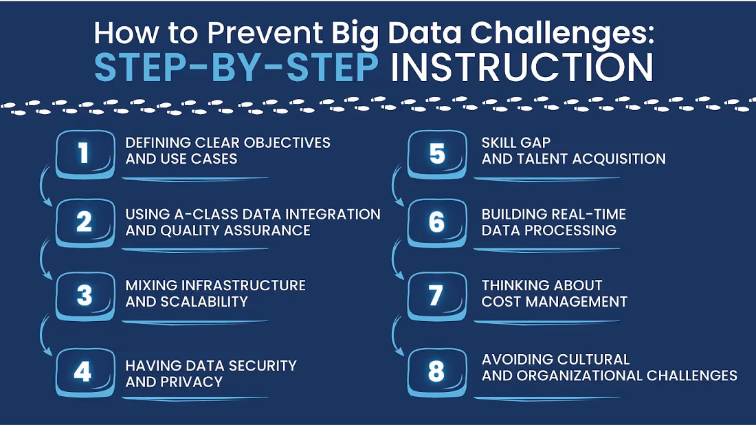 One of the initial challenges is defining clear objectives and identifying relevant use cases for big data analytics. Without a clear understanding of what the organization aims to achieve and how big data analytics can support those goals, the implementation process can lack direction. It is crucial to align the analytics initiatives with strategic objectives, prioritize use cases based on their potential impact, and ensure stakeholders are involved in the process.Solution 1. Be Aware of How to Get and Use InsightsDevelop a compelling and feasible business justification for your project, involving business professionals to gain a deeper comprehension of their data collection requirements and the actions they can take based on it.Incorporate advanced analytics to uncover novel approaches for interpreting and comprehending insights, ensuring that these valuable findings are easily accessible to all members of the organization.Supply the organization with contemporary visualization tools, interactive dashboards, and user-friendly interfaces that enable data exploration, report generation, and seamless data communication within the company.