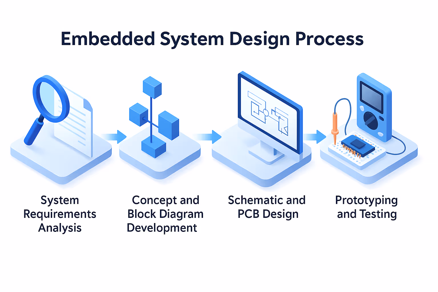 The first stage of embedded system design is system requirements analysis. At this level, the device’s functions, operating environment, performance criteria, measurement accuracy, power consumption, and compatibility with other systems are defined. The analysis also includes budget constraints, assumptions regarding mass production, safety standards (e.g., EMC, ESD), and the expected durability of components. A properly conducted analysis helps avoid costly design changes in later phases of the project.The second stage involves developing the concept and block diagram, which represents the logical structure of the system and the relationships between its modules. Here, advanced systems designers often rely on model-based design tools or co-simulation environments to validate architecture choices before committing to physical layout. The block diagram serves as the foundation for further design decisions. It defines how signals are processed, how data flows, which communication interfaces are used, and how functions are divided between hardware and software. This is also the stage where assumptions related to computational power, bandwidth, and energy requirements are verified.The next step is the design of the electrical schematic and PCB. At this point, specific electronic components are selected, their interconnections are developed, and the layout of the printed circuit board is created. Particular attention is given to signal integrity, noise minimization, and system immunity to interference. Compliance with Design for Manufacturing (DFM) and Design for Testability (DFT) principles is also required in every embedded system producing process.The final stage is hardware prototyping and testing. The completed prototype undergoes functional, thermal, and mechanical testing, and the results are used to make design adjustments. Only after successful validation of the prototype can the project proceed to the implementation or certification phase.