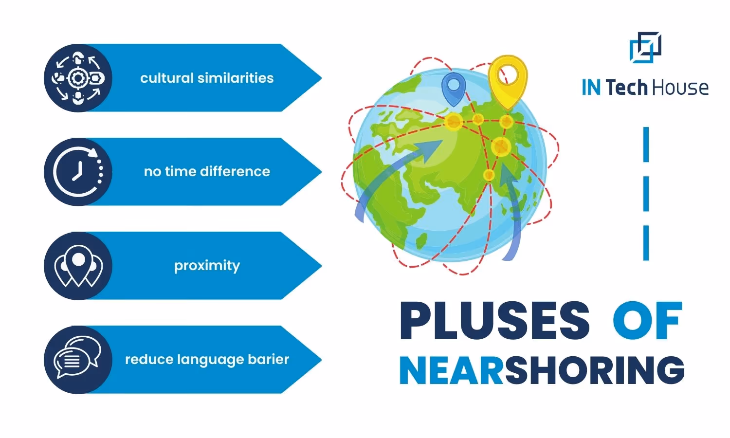 Cultural similarities: Nearshoring allows companies to work with outsourcing partners who share similar cultural norms and values, which can help to foster better communication and collaboration.No time difference: Nearshoring to countries in the same or similar time zones can make it easier to coordinate the work of a partnering company and communicate in real time.Proximity: Nearshoring allows companies to visit their outsourcing partners more easily, which can be useful for building relationships, conducting training, and ensuring quality control.Reduced language barriers: Language barriers can be less of a problem with nearshoring partners in neighboring countries who often have a good command of the same or similar languages.