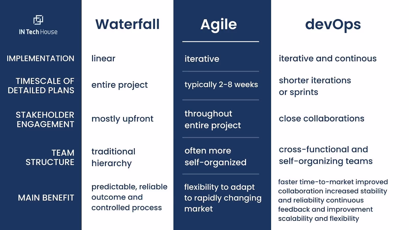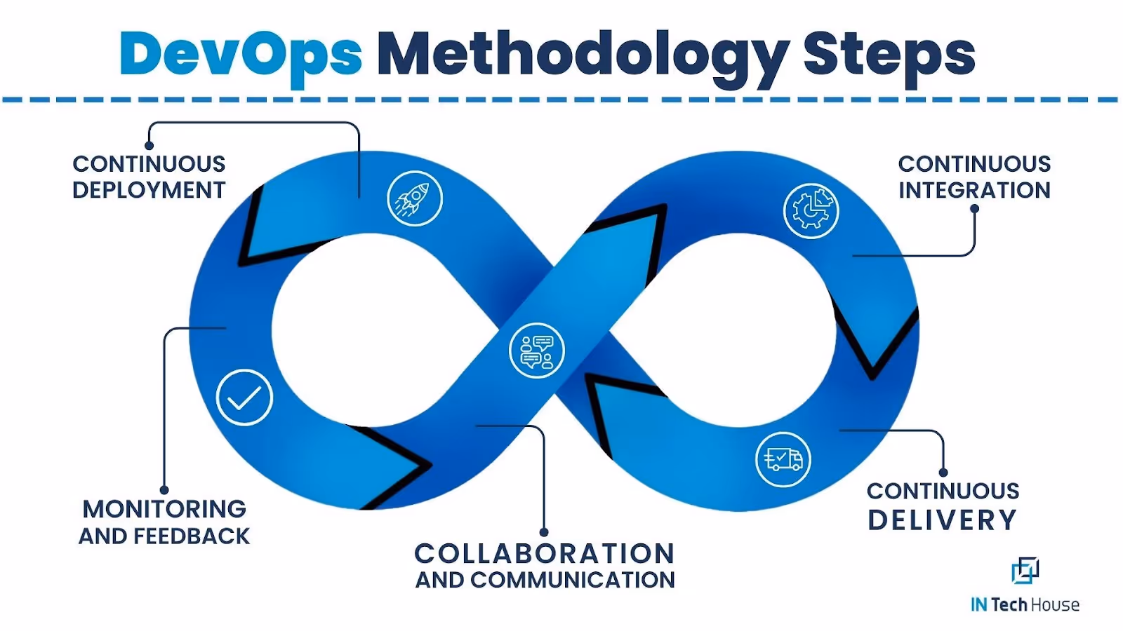DevOps methodology is beneficial for businesses that seek to improve collaboration between development and operations teams, accelerate software delivery, enhance software quality, and ensure reliable and scalable deployments. It is particularly relevant for:Software Companies: DevOps helps software companies streamline their development and deployment processes, allowing them to release updates and new features more frequently and reliably.Technology Startups: Startups can leverage DevOps to quickly iterate on their products, gather feedback, and respond to market demands with shorter release cycles.E-commerce and Online Businesses: DevOps enables e-commerce and online businesses to achieve faster time-to-market for their digital products and services, ensuring a seamless user experience.Enterprises: Large enterprises can adopt DevOps practices to overcome organizational silos, enhance collaboration, and improve the efficiency and stability of their software delivery pipelines.Cloud-Based and SaaS Companies: DevOps aligns well with cloud computing and Software-as-a-Service (SaaS) models, enabling efficient deployment, scalability, and management of cloud-based applications.It’s important to note that while DevOps can bring numerous benefits, its successful implementation requires a cultural shift, investment in automation tools, and continuous improvement.INTechHouse AdviceWhen it comes to choosing the right methodology for software development, there are several factors that companies should consider. Here are some key pieces of advice to help businesses make an informed decision:
